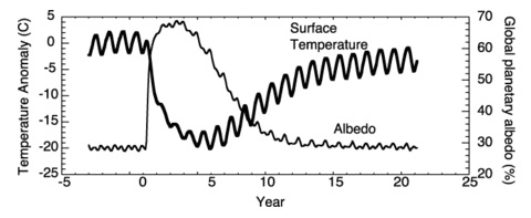 … montre les effets, sur le climat global, de l’éruption du Toba, en Indonésie, vers -73’000, qui a émis dans les 3’800 Km3 DRE et a provoqué une chute générale de températures de -20°C; dans ces conditions, une lueur crépusculaire à midi, il n’y aurait actuellement en Europe plus du tout d’agriculture pendant au moins 10 ans; c’est dans ces conditions que notre espèce a frôlé l’extinction, les derniers survivants ont vécu misérablement pendant des siècles dans la cuvette du Congo, entre autres.